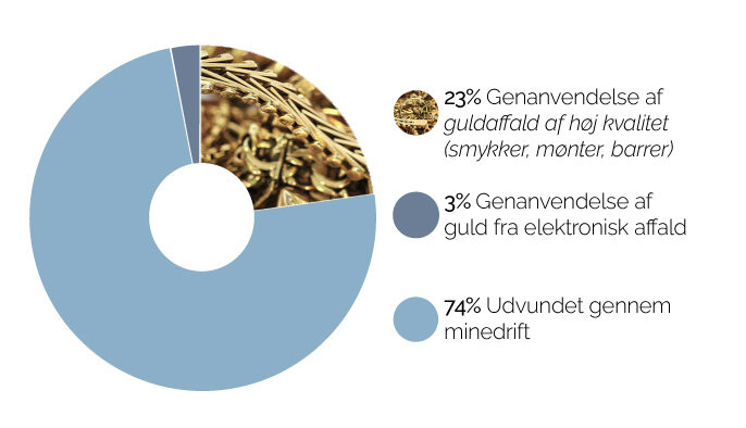 Det guld, du køber hos Aktiv Guld, er netop genanvendt guld. Vi samarbejder med partnere, som garanterer, at deres produktion udelukkende består af 100 % genanvendt guld. Her analyseres guldaffaldet før det tilføres genanvendelsesprocessen og identificeres der i den forbindelse nyudvundet guld fra minedrift, sorteres dette fra og sendes retur.